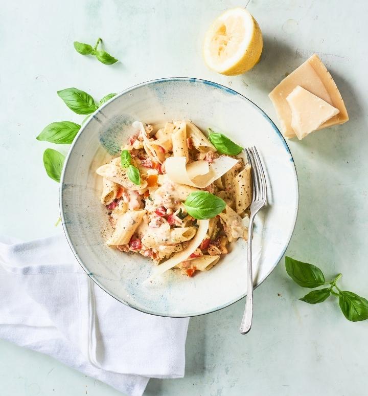 Pastaret med frisk basilikum og parmesan