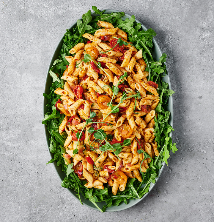 Ingredienser:1 kg Insalata Mediterranea200 g rucolaÆrtespirer til pynt